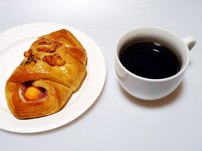 カップの隣のパンが歯の抜けた爺さんがわらっているよう