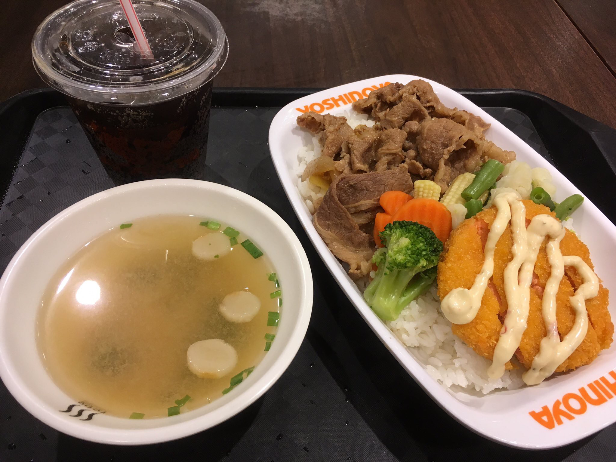 日本よ、これが世界のYOSHINOYAだ めっちゃオシャレでケーキまで売ってる 味もほぼ同じで、味噌汁が鰹節効いてて妙にうまい。しかも美人なお姉さんもいた!