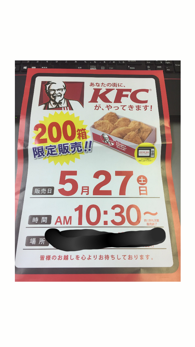 比較的近所にKFC2件あるけどたまーにスーパーで出張販売とかやってるんだよねわざわざわざ来てくれなくても近所に店あるんだから、そっちいくって