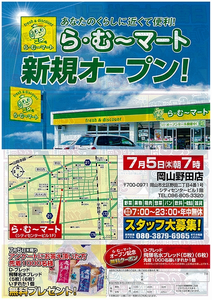 近所に4軒もあるけど、24時間営業じゃないし(7~23時)、ラ・ムーやディオより値段が高い&品数が少ないので、ラ・ムーやディオ行ってる。