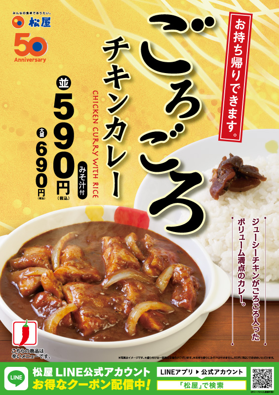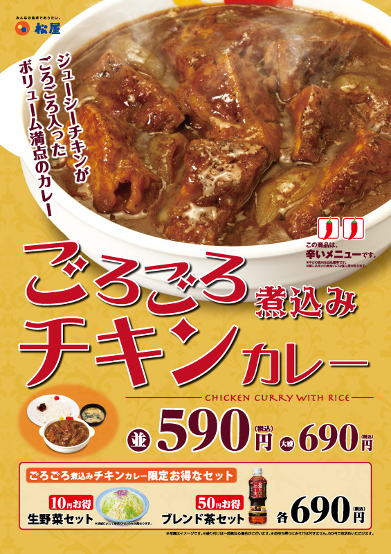 「ごろごろ煮込みチキンカレー」は、数種類のスパイスが配合されたすっきりとした味わいの松屋オリジナルカレーに、鉄板でジューシーに焼き上げた鶏もも肉をプラスしたゴロゴロ感たっぷり食べ応え満点な逸品です。