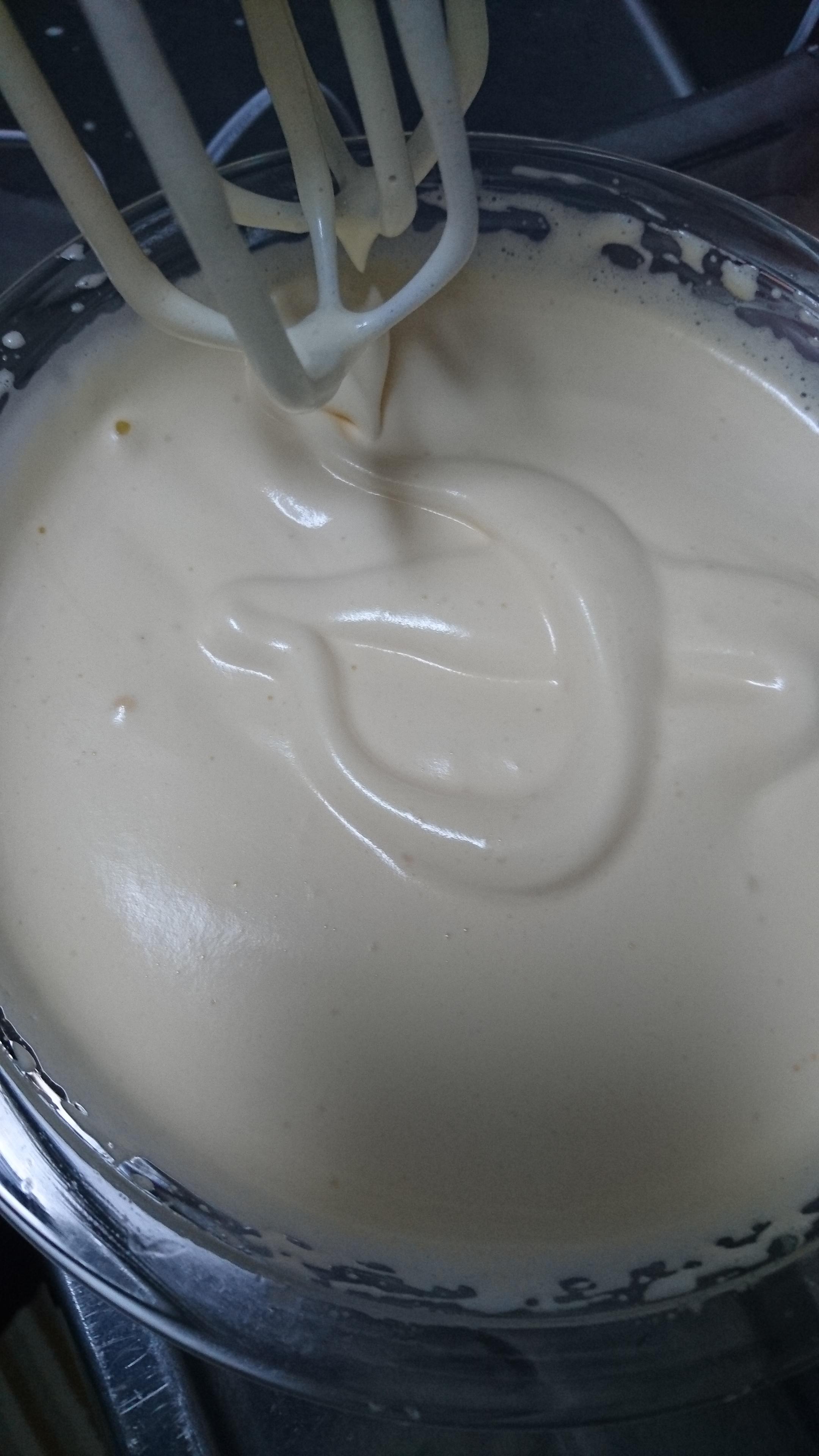 ほんのり泡立ってきたかな?と思うところでホイップクリームもくわえ更に混ぜていき、もったりしている7分立てくらいにしておきます(写真撮り忘れた)