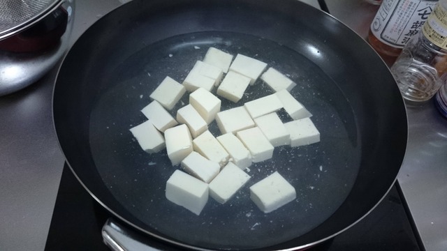 熱々に温めておくと同時に塩で下味も付けて、豆腐投入と同時に即仕上げられるように
