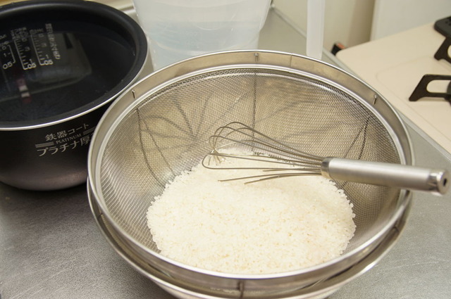 米を泡だて器で洗うのもなし。米は手で研ぐもんだ