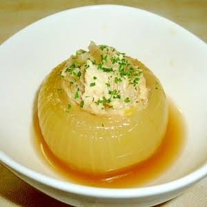 玉ねぎの煮付けの上に刻み玉ねぎ