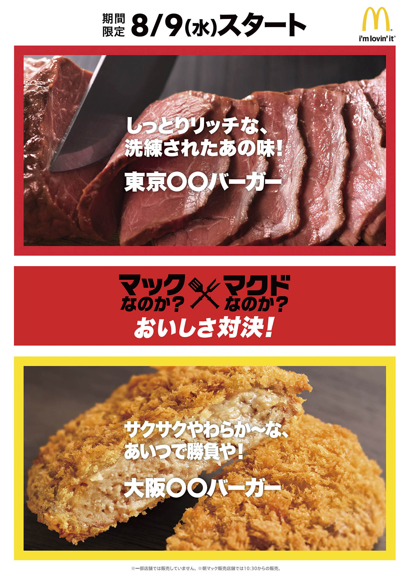 そこでマクドナルドが、今までにない公式史上初の「マックなのか? マクドなのか? おいしさ対決!」を企画。なんと、マック軍として「東京〇〇バーガー」、マクド軍として「大阪〇〇バーガー」を販売し、そのおいしさで勝負するというのである! マック軍、マクド軍、商品名に対するツイート数などで勝敗を決めるという。