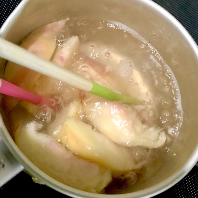 鍋に桃入れて 砂糖と水、適量