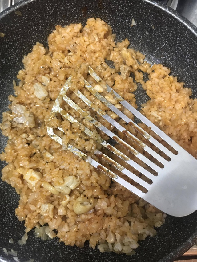 ・玉ねぎと鶏肉炒めた後にケチャップを入れて水分を飛ばしてからご飯を入れると