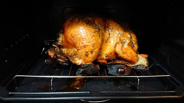 オーブンに入れて焼きはじめます うちのオーブンのオートメニューにローストチキンがあったのでローストチキンモードでスタート