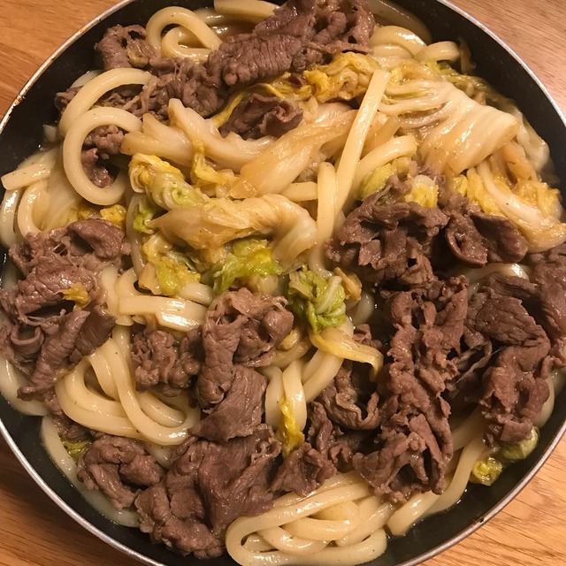 うどんも肉も野菜も皆入れて煮込むんだよ。うどんに味染みて旨い。卵絡めてな