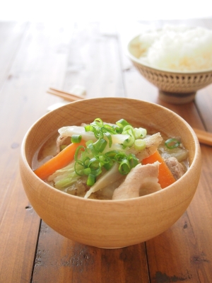 豚汁はジャガイモニンジン玉ねぎゴボウの根菜だけで