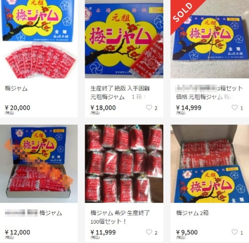 そのため、メルカリやヤフオク!では希少性が高まることを見込んだ高額出品が相次いでいる。駄菓子屋などでは1袋10円で販売されている「梅ジャム」が、1箱(40袋)5000円など10倍以上の価格を付けた出品が多数。「生産終了 絶版 入手困難」「貴重な駄菓子の最後の大人買いにいかがでしょうか?」「これからどんどん値があがると思います」といった売り文句が添えられ、中には45倍の価格にあたる40袋1万8000円での出品もある。