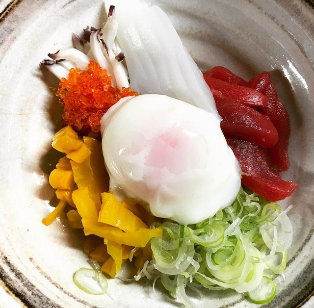 マグロ赤身、イカ、たこ、納豆、トロロ、茹でモロヘイヤ、茹でオクラ、刻みキムチ、わさびと鰹の削り節と醤油適量。
