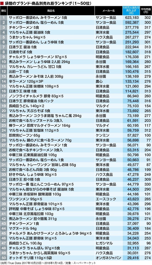 カップ麺と袋麺。どちらを買うことが多いだろうか。お湯を注ぐだけで食べられるカップ麺と違って、袋麺の場合は鍋でお湯を沸かし、食器を用意して、場合によっては野菜や肉などの具を入れるなどと一手間を要するものの、インスタント食品の名のとおり、手軽に食べられる食べ物として重宝している人は少なくないだろう。 カップ麺では、「『カップ麺』売れ筋トップ100商品」(2016年7月17日)で示したように、全国的には「カップヌードル」(日清食品)の人気が最も高く、「マルちゃん 赤いきつねうどん」(東洋水産)、「シーフードヌードル」(日清食品)、「マルちゃん 緑のたぬき」、「ペヤング ソースやきそば」(まるか食品)などという定番が強い。 https://headlines.yahoo.co.jp/article?a=20180204-00206871-toyo-bus_all DSC_6442_m