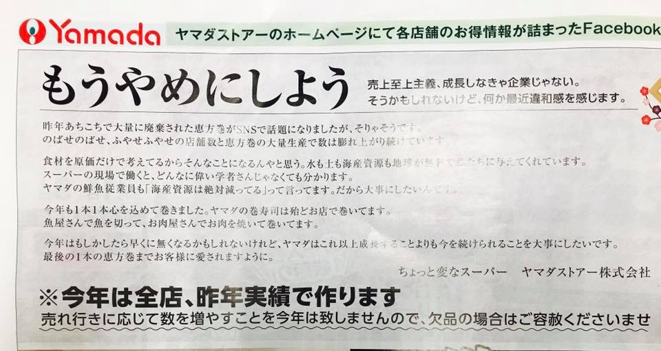 ヤマダストアーに称賛って、根本的に恵方巻きなんて1本たりとて作るなって話だ