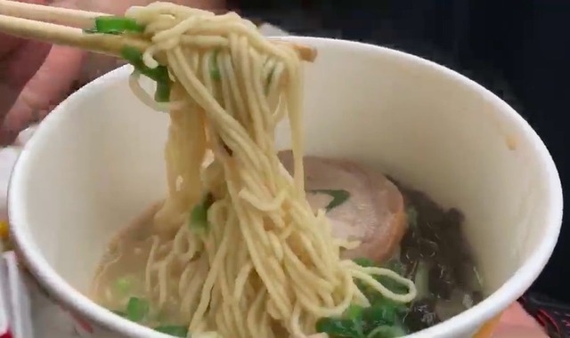 特注した麺を使った自慢の博多ラーメン。食べた男性は「温かくて美味しい。食べると元気になる。いいね!」と親指を立てた。