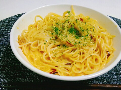 ちなワイの晩飯のぺぺたまスパゲッティ