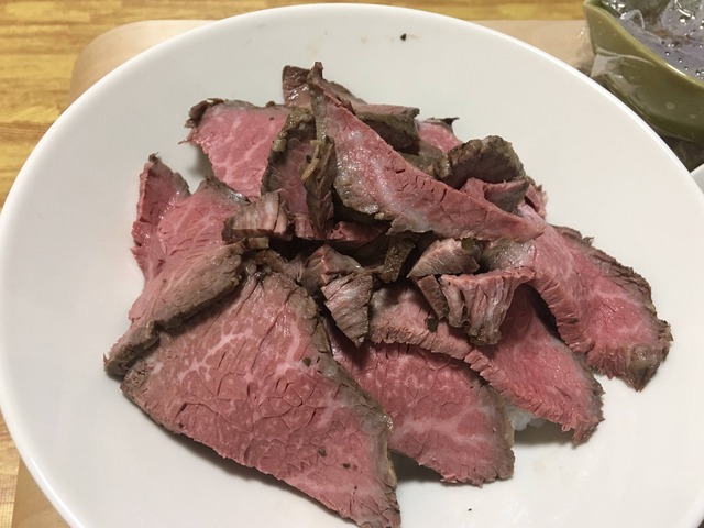 色々あるだろうけど分かりやすく写真の両者、ご飯に合わせる目的の割りに切り分ける際に常識のよくあるローストビーフの厚さに切ってるのがまず雑魚い。
