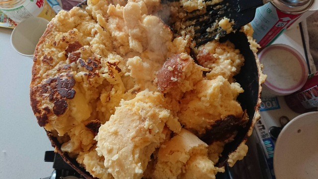 卵溶いて牛乳で薄めて粉を少しずつ入れていって、良い固さになったらトロ火で蓋をして放置・・・とか応用出来る人間は、洗い物減らす為に無謀なコトしないよなあ(^^;