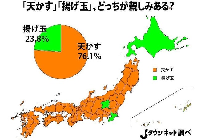「カス」という響きに良いイメージがないことから、「揚げ玉」は東日本中心に用いられ、そんなことはお構いなしの西日本では「天かす」……と俗説には言われるところ、結果は「天かす」の圧倒的な力を持っていることが明らかになったのである――。