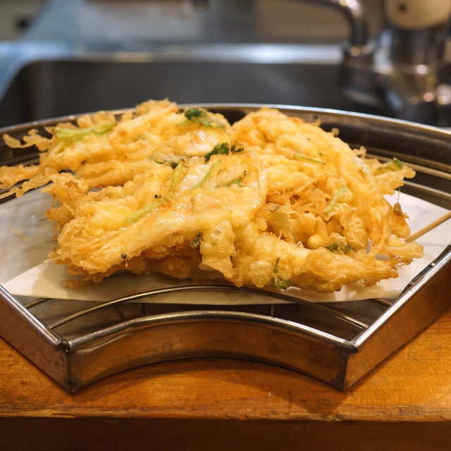芝エビと小柱に三つ葉を加えたかき揚げ