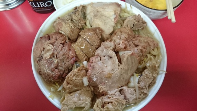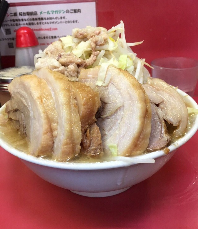 はじめて野猿街道の次郎へ行ったとき、小豚を頼んだが、危険を感じて、野菜と麺を半分にしてもらったはずなのに、満面の笑顔で普通の店のチャーシュー麺大盛をはるかに上回るものを渡された・・・。