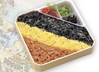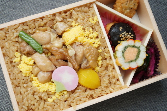 鮎の出汁で炊き込んだご飯の上に、骨まで食べられる鮎の甘露煮が丸ごと一匹乗っている、味だけじゃなくて見た目にもインパクト絶大な弁当。