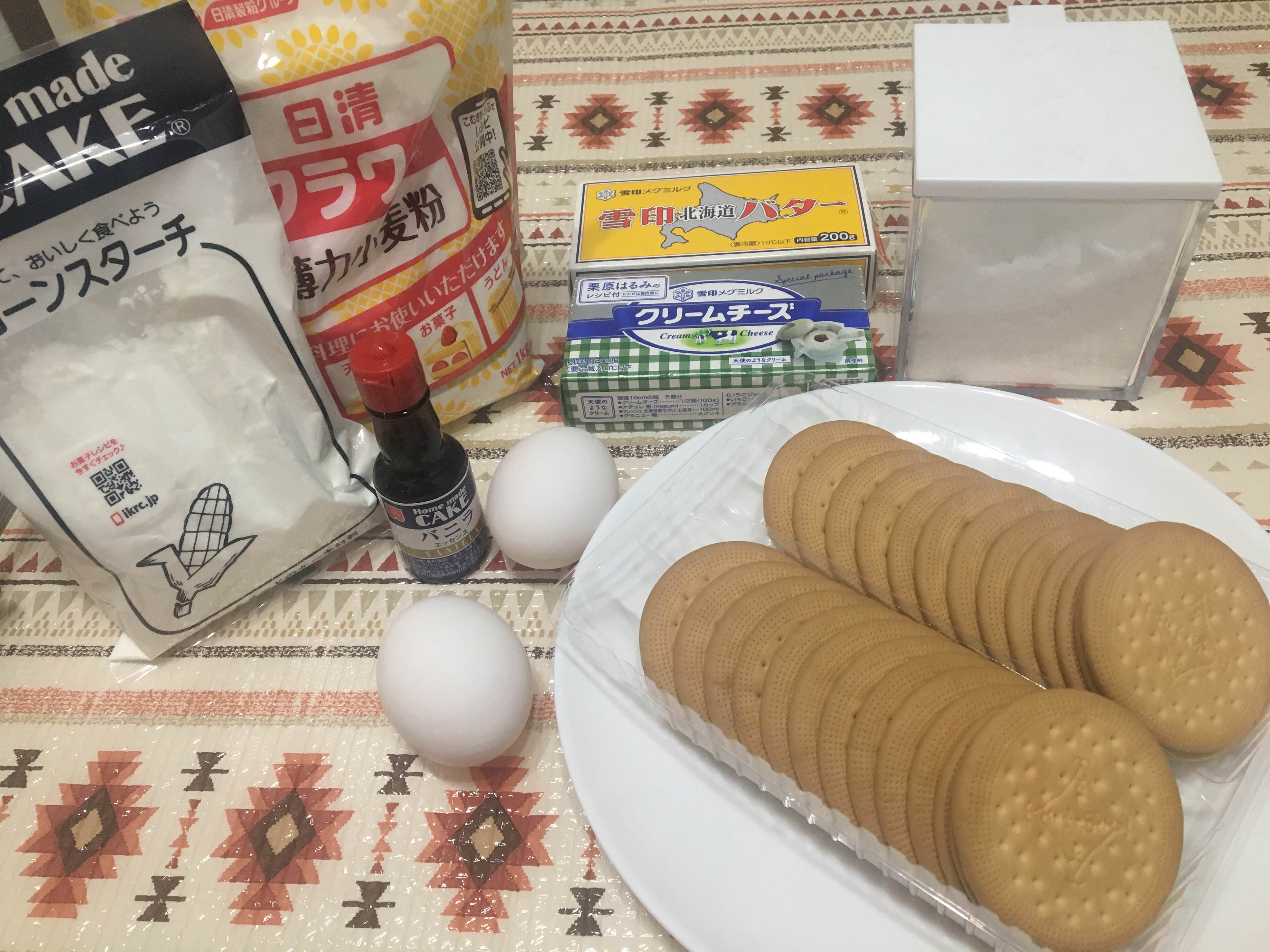 用意するのはビスケット、砂糖、コーンスターチ、バニラエッセンス、クリームチーズ、小麦粉、卵、バター、以上や