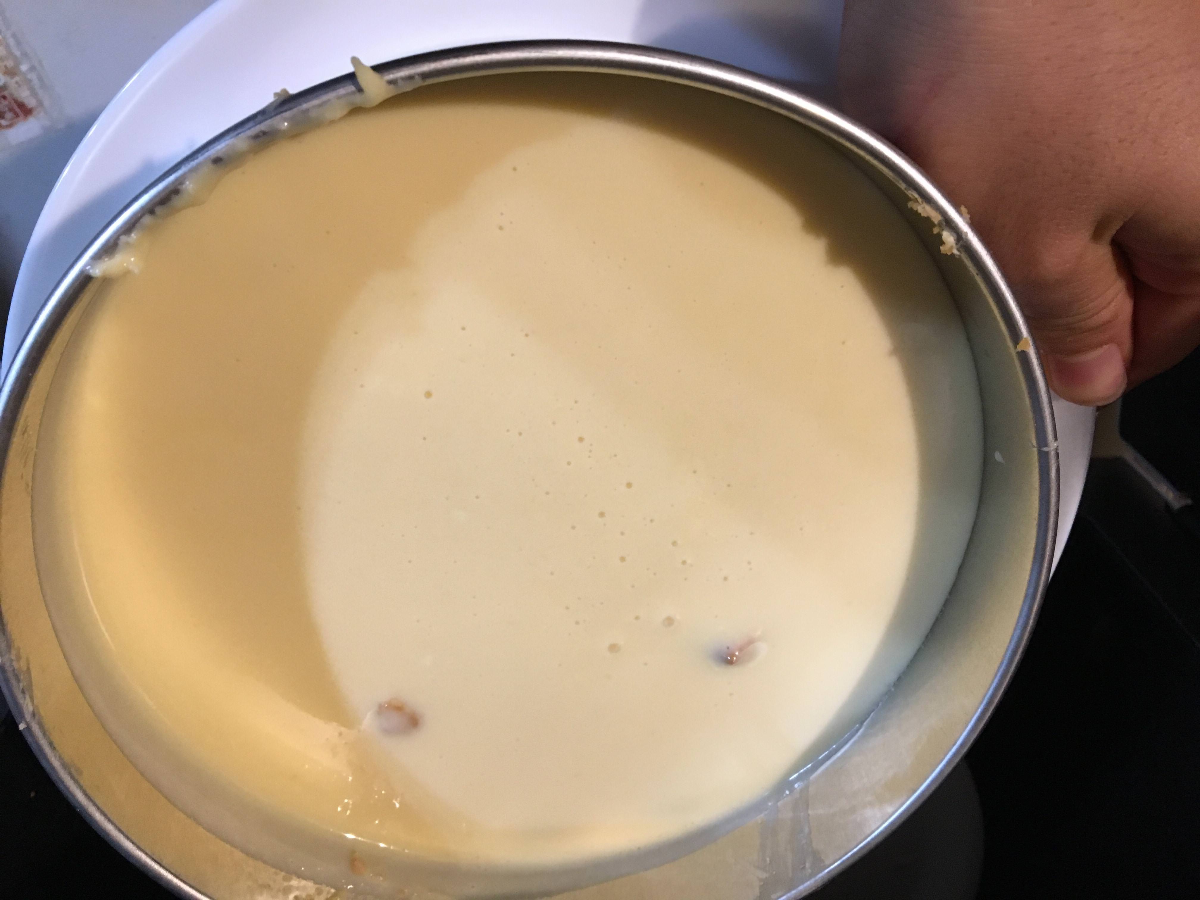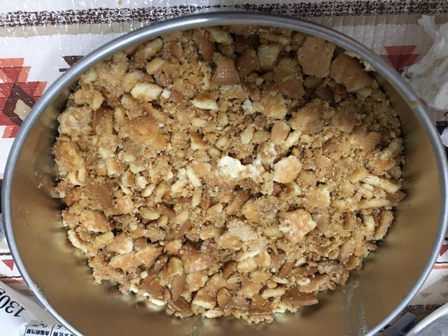 下地のクッキーもっと砕いて敷く時に上から押しつぶさないと駄目、何の為にバター入れたと思ってるねん