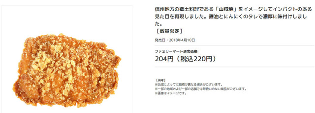 http://www.family.co.jp/goods/friedfoods/0253802.html 信州地方の郷土料理である「山賊焼」をイメージしてインパクトのある見た目を再現しました。 醤油とにんにくのタレで濃厚に味付けしました。 うまそうすぎ