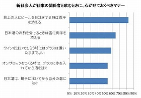 「新社会人に向けて伝えたい酒席マナー」――。酒文化研究所は2013年4月10日、こうしたテーマで酒好きのモニター198人を対象に実施したアンケート結果を公表した。 先輩へのお酒の注ぎ方や、宴会の途中退席の仕方などフレッシュマンにとって参考になる内容が盛り込まれている。 途中退席の際は「事前申告」を 「酒席での新社会人の振る舞い方」としてモニターが薦めているのは、支持の高い順で (1)「目上の人にビールを注ぐときは両手を添える」83% (2)「日本酒のお酌を受けるときは盃に両手を添える」65% (3)「ワインを注いでもらうときはグラスは置いたまま」59% (4)「日本酒を飲むときは相手に注いでから自分の器に」53% (5)「オンザロックはグラスに氷を入れた後に酒を注ぐ」53%など。 先輩にビールを注ぐタイミングについては「なくなってから」「減り始めたら」で意見が分かれ、同研究所は「『お注ぎしましょうか』と一声かけるのが最も評価されるのでは」という。 宴会を途中退席する際のマナーとしては、「幹事格の人や上司に事前に知らせておく」 「退出時は左右の人、上司にそっと声掛けする」「みんなの酔いが回らないうちに抜ける」などに支持が集まった。 また先輩からご馳走されたときは、その場で礼を言うことに加え、「たとえ面倒でも翌日必ずお礼を言う」ことが大事という。 このほか、「相手が吸うまでタバコは吸うな」「携帯はいじるな」といった意見も目立った。 http://bg-mania.jp/2013/04/12097083.html