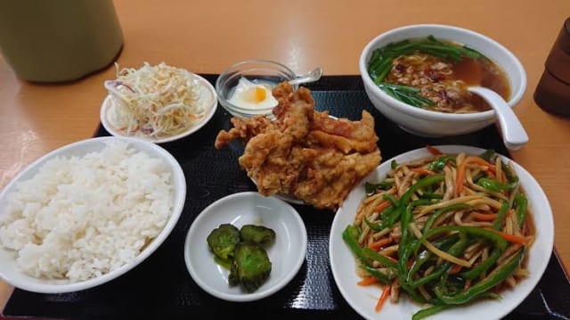 ご飯、唐揚げ、ラーメン、青椒肉絲、漬物の平均的中華セットやん