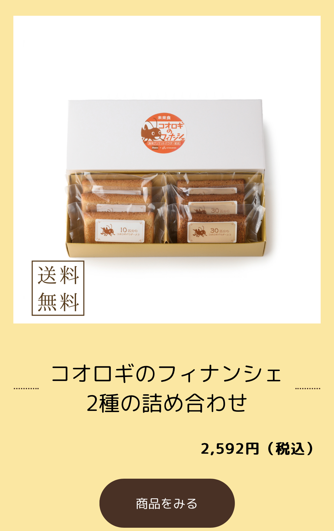 って計算すると、コオロギのフィナンシェ2種の詰め合わせ2,592円(税込)、ってのは高くは無いんやな