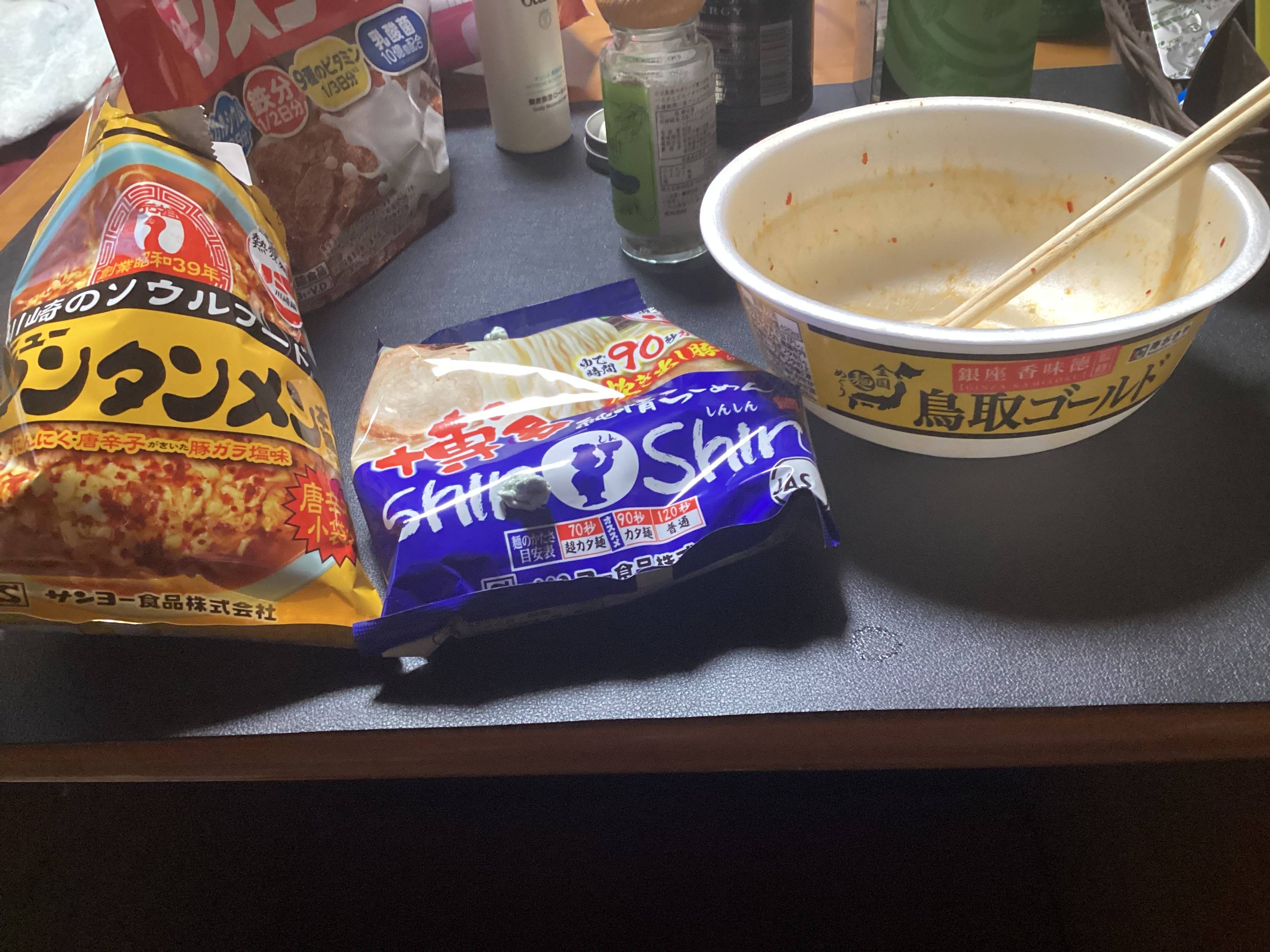 あと、インスタント麺は素だと1食500キロカロリーぐらいで低め、3食とっても成人男性の必要カロリーに足りてないことが多い。