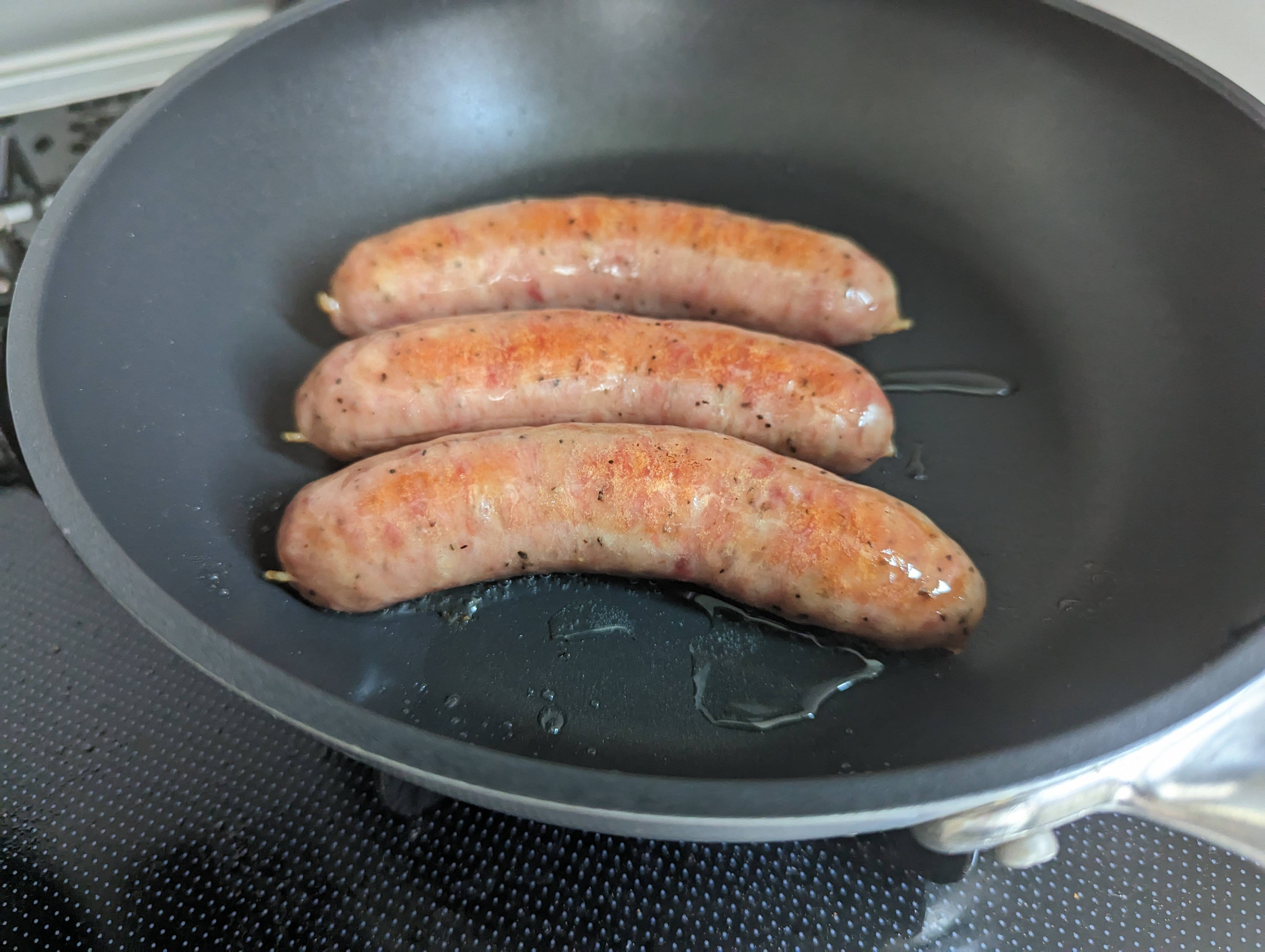 白ワインでも熱したフライパンではフランベできるし、ハーブの効いたソーセージに合う香りが付く