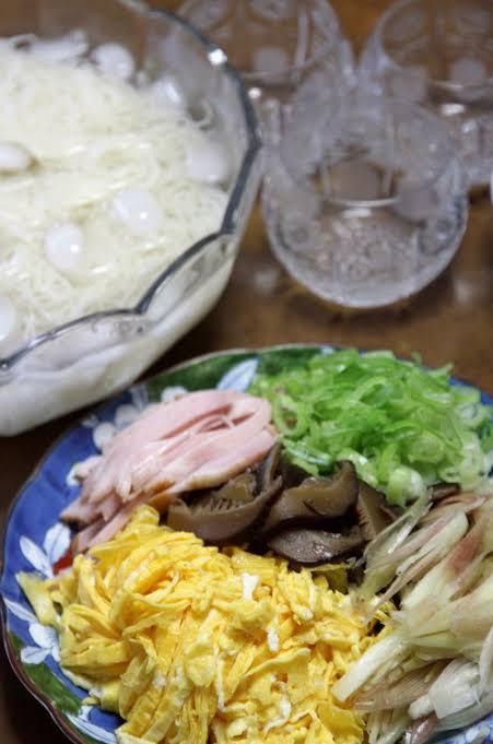 一人前ずつ分けて氷水に入れてそうめんつゆに色んな具材ぶち込んで食うものだろ?
