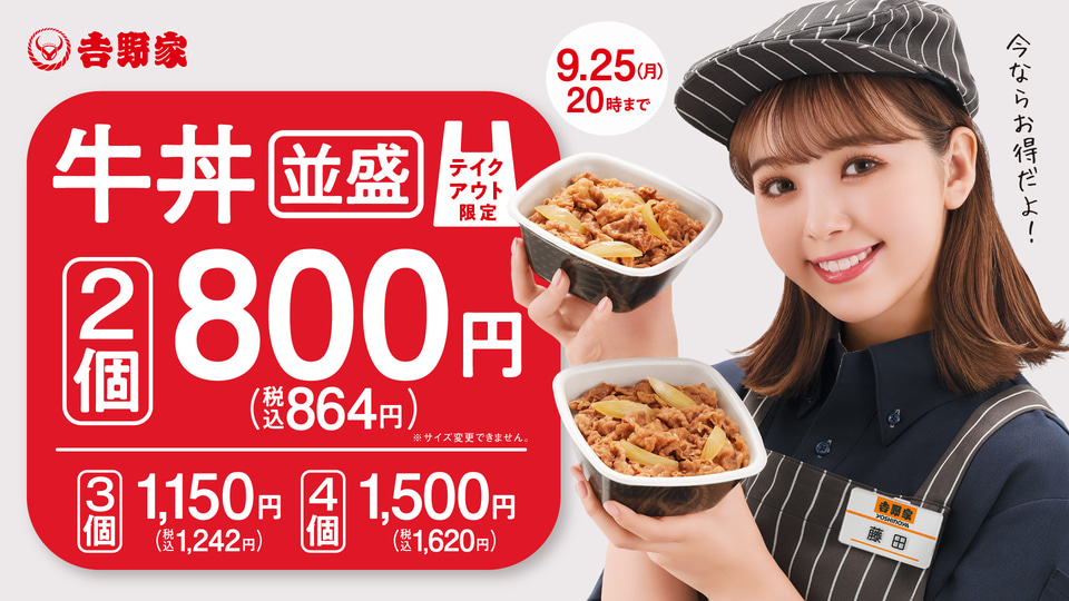 >牛丼並盛を2個以上購入すると通常880円のところ、864円で提供する