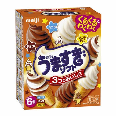 明治は7月下旬から、箱入りラクトアイス「うずまきソフト」のパッケージを「うますぎソフト」に変更し、全国で売り出す。遊び心たっぷりの仕掛けで、中心ターゲットのファミリー層に親しみを持ってもらう狙いだ。