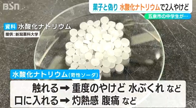 五泉市教育委員会や複数の保護者によりますと、17日に五泉市内の中学校で行われた理科の実験で使われた水酸化ナトリウムを、1人の男子生徒が隠して持ち出し、お菓子だと偽って下級生2人に食べさせようとしたということです。