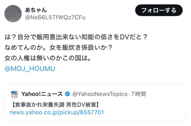 相談件数5年間で1・5倍 増える男性のDV被害 年上の妻に食事抜かれ栄養失調 国際男性デー ■「あなたは生きている価値がない」 スマートフォンや現金は取り上げられ、その日もほとんど食事は与えてもらえなかった。不思議と空腹は感じなかったが、大村正人さん(34)=仮名=は自宅で倒れ、そのまま病院に搬送された。 「あなたは生きている価値がない」「クズ親から生まれたお前もクズ」 約2年前から同居し、 昨年1月に自治体のパートナーシップ宣言をして事実婚生活に入った5歳年上の妻は、些細(ささい)なことで暴言を吐く人だった。 トイレにわずかな水滴が落ちていただけで激高。大村さんは正座させられ、平手で顔面を殴られることもあった。避けるために振り上げられた手をつかむと、逆に言い返された。「私に暴力を振るうのか」 https://news.yahoo.co.jp/articles/8ecec7073cc2bec1007eefc4f158ebcd0d6277cb