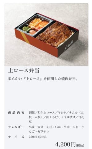 具体的には、牛薄切弁当2,900円、カルビ弁当3,500円、上ロース弁当4,200円、上カルビ弁当4,700円、特選サーロイン弁当4,700円などが代表的です(税込価格は変動する場合があります)。 やで