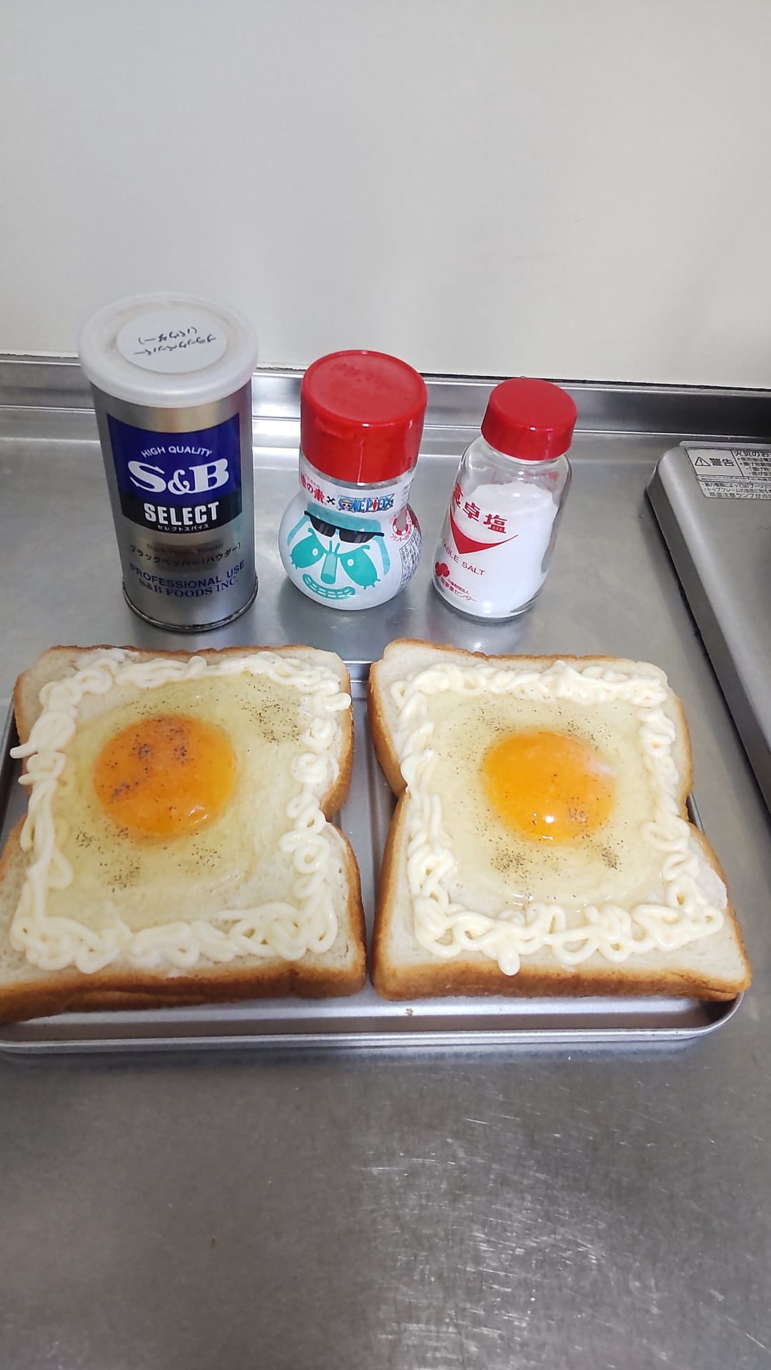 食パンにマヨネーズで四角に囲って生卵を載せて焼いたトーストあるやん