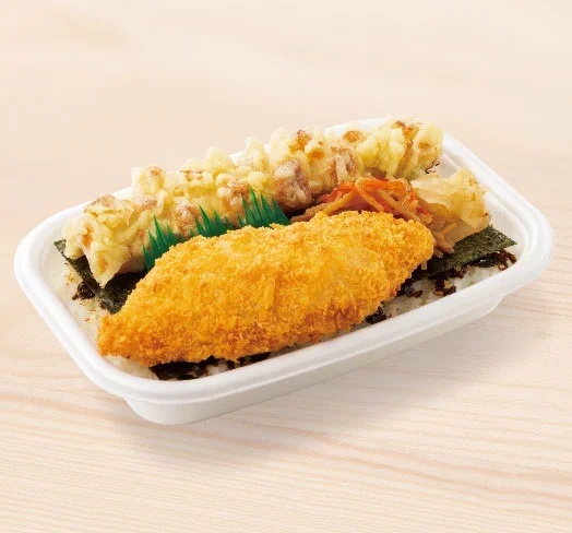 ごはんの上に盛り付けられたおかか昆布とのりに、サクサク衣の白身フライと食べ応えたっぷりのちくわ天がのった素朴な魅力が光る人気商品です!